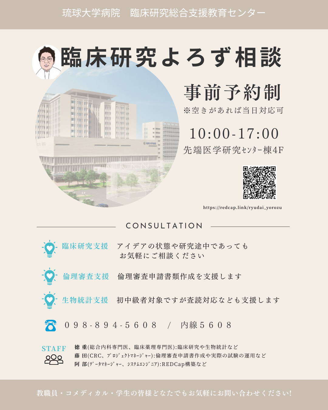 「研究に関する相談・お問い合わせ」が「臨床研究よろず相談」に変更となりました。